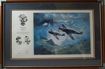 Adolf Galland, commanding General of all Luftwaffe fighters, and Erich Hartmann, with 352 aerial victories the ace of all fighter aces, fly their Me 109 fighters through the majestic landscape of the Alps. Both are recipients of the very rare decoration; Oak Leaves, Swords, and Diamonds with the Knight's Cross of the Iron Cross.